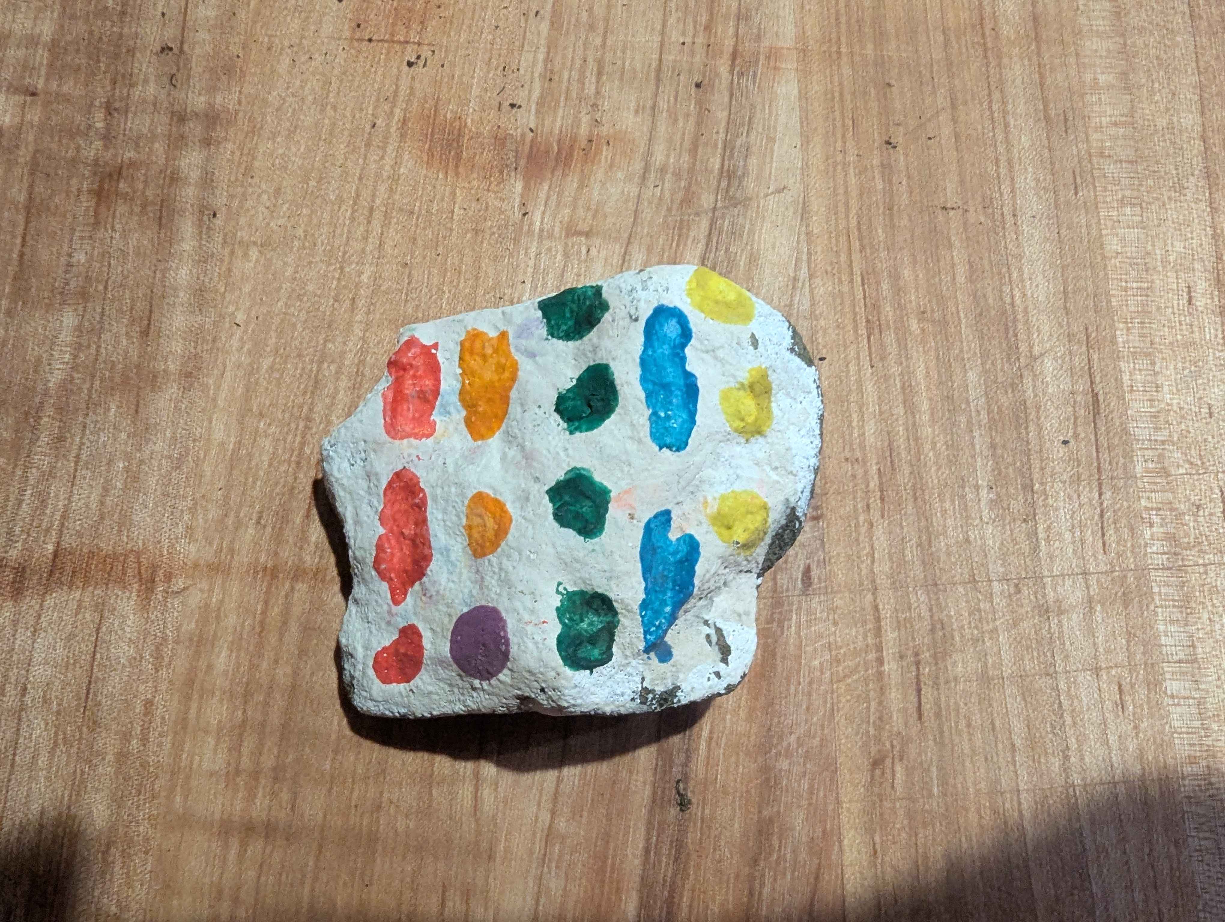 | This was a physical puzzle consisting of a rock painted white with some multi-colored dots and lines on it. | ||||